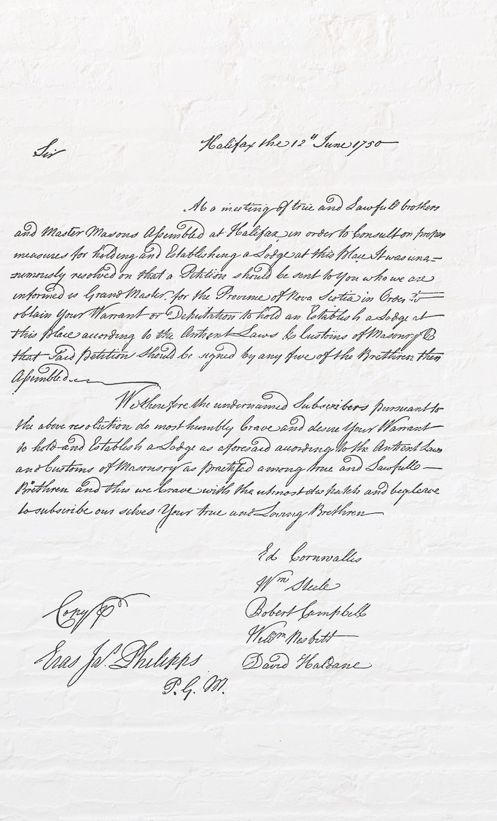 A copy of the petition to Philips dated June 12th, 1750, signed by Edward Cornwallis and the other Brethren, is in the archives of the Grand Lodge of Massachusetts, but this would seem to have been a second application, for the Halifax Lodge is referred to in the Grand Lodge minutes of April 13th, 1750, a circumstance probably explained by the fact that the petitioning Brethren had previously applied to the St. John's Grand Lodge, Boston, and had been referred by that Lodge to the Provincial Grand Master.